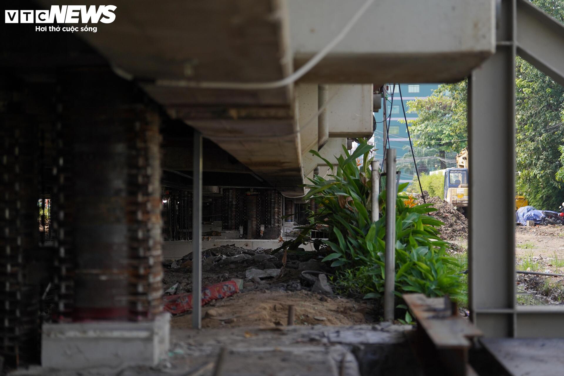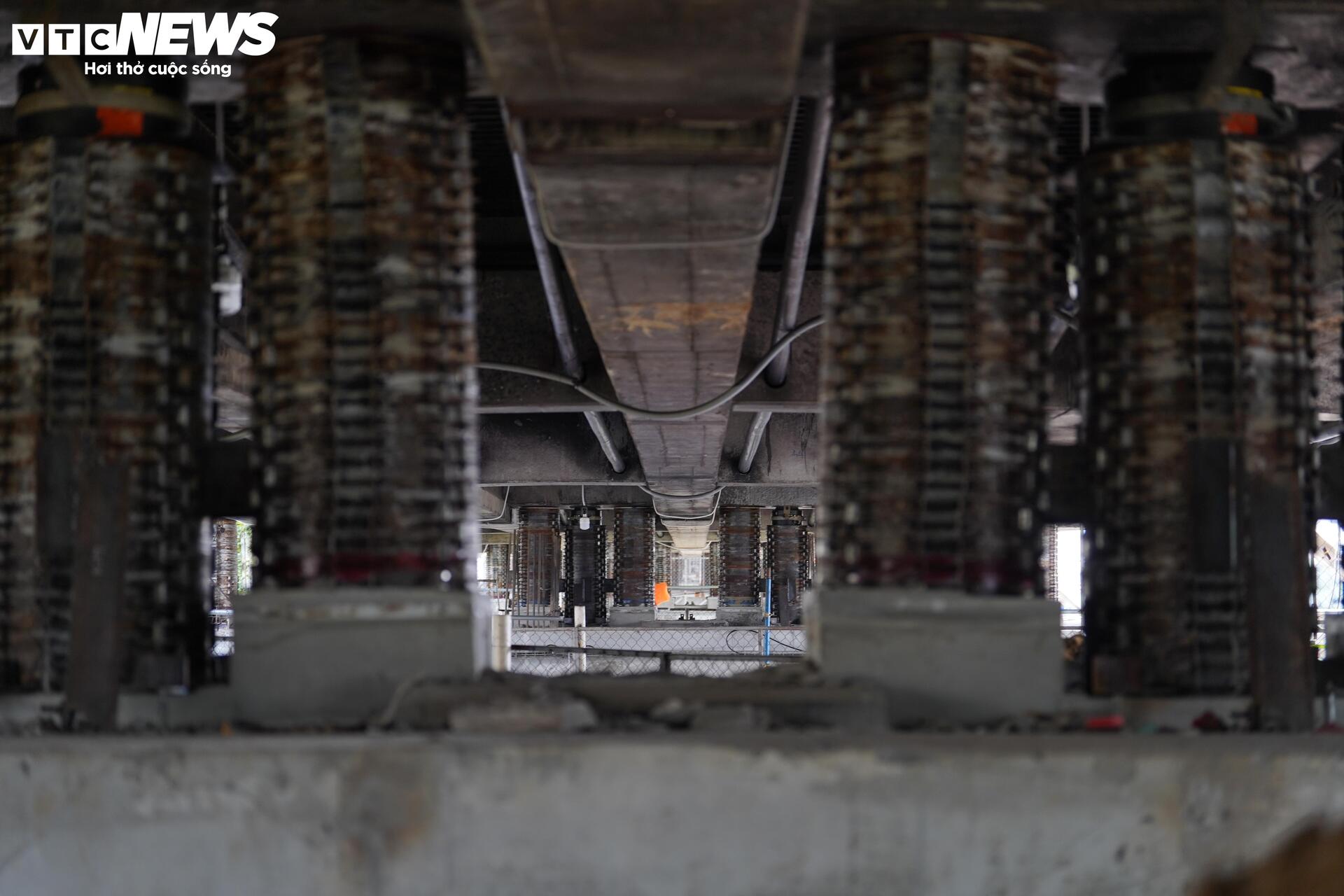 Dưới gầm cầu, từng lớp thép kê đỡ xếp chồng vững chắc, tạo nên một không gian vừa lặng lẽ vừa căng thẳng. Tại đây, mỗi nhịp nâng đều được tính toán kỹ lưỡng, phản ánh sự cẩn trọng và chuẩn xác trong từng thao tác kỹ thuật.