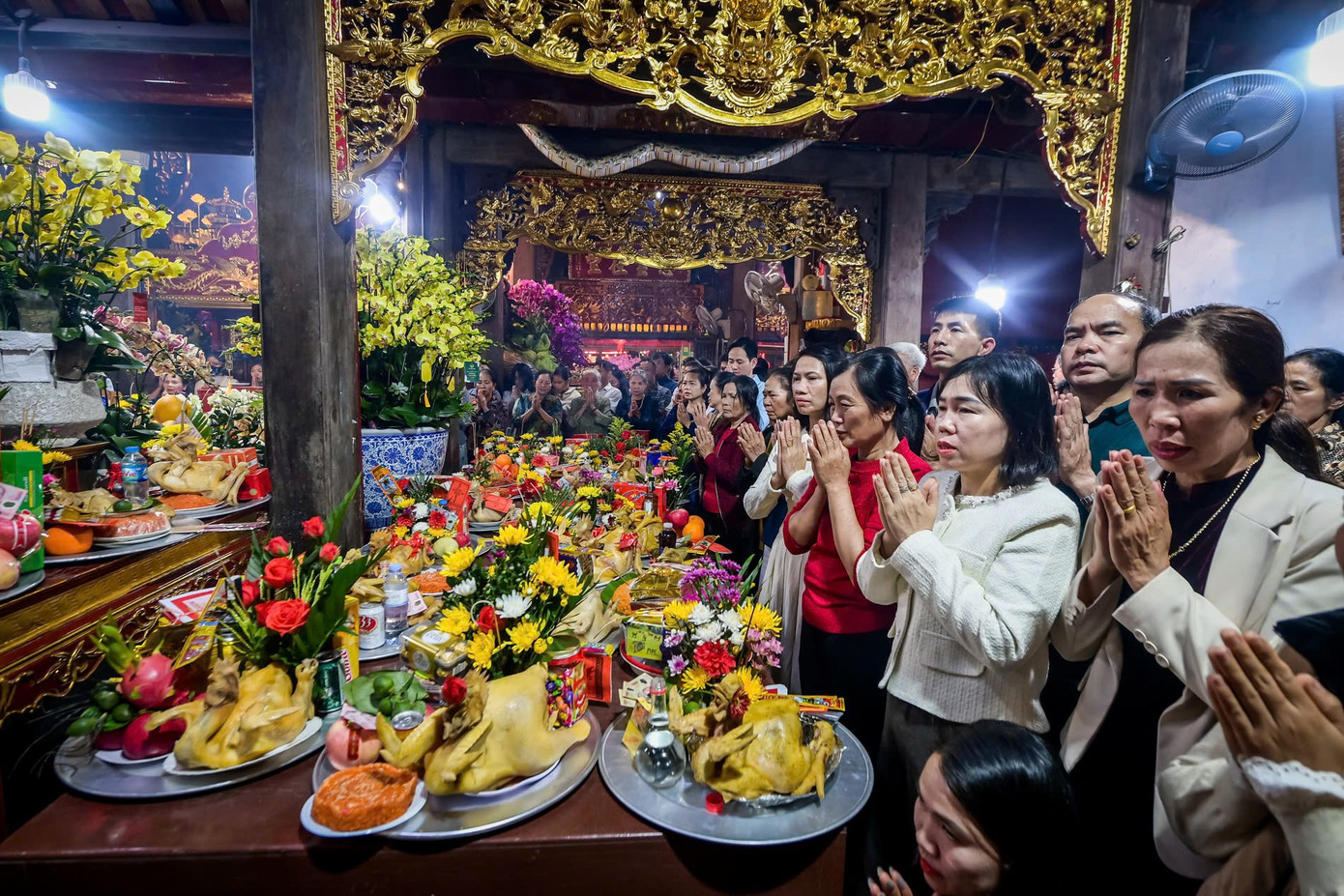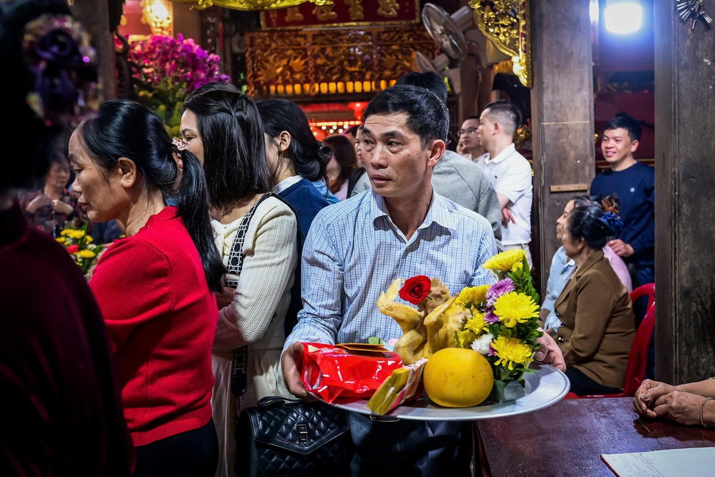 Khi kim đồng hồ điểm 0 giờ, khuôn viên Phủ sáng rực ánh đèn, khói hương nghi ngút quyện trong tiết trời xuân se lạnh. Dòng người xếp hàng dài, trên tay là những mâm lễ được chuẩn bị cẩn thận. Ai nấy đều thành tâm, trang nghiêm chờ đến lượt dâng hương. Để phục vụ lượng người đông, ban tổ chức đã bố trí khoảng 60 bàn dài quanh điện thờ, tạo điều kiện thuận lợi cho người dân đặt lễ.