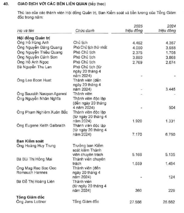Đáng chú ý, Tổng Giám đốc Jens Lottner nhận 27,556 tỷ đồng tiền lương trong năm 2025, tăng 1,894 tỷ đồng so với năm trước, tương ứng tăng khoảng 7,4% – mức cao nhất trong ban lãnh đạo và gấp 6 lần thù lao của Chủ tịch Hồ Hùng Anh.